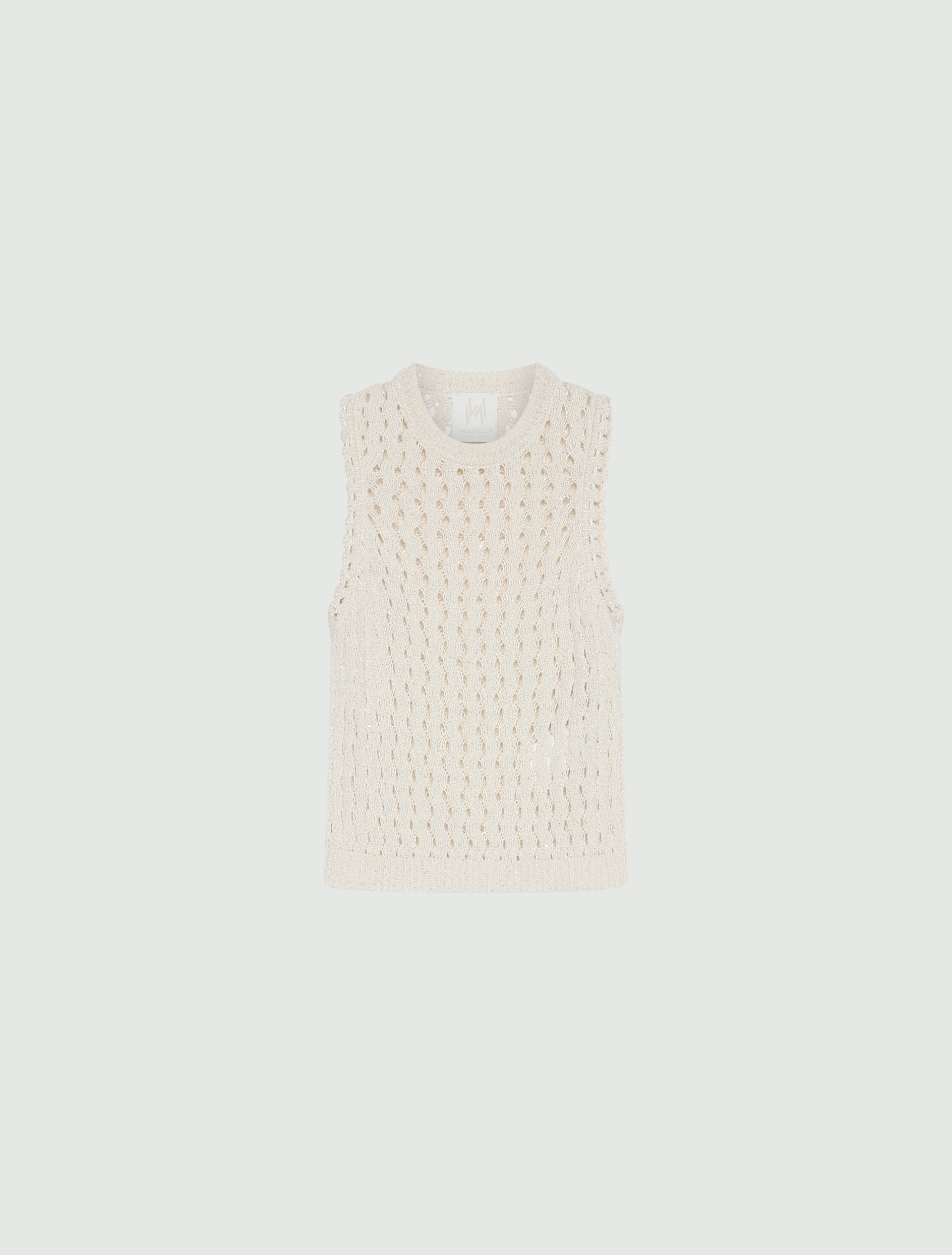This sleeveless and slightly sheer mouliné cotton top is enlivened by gleaming micro sequins. The wavy and perforated knitted pattern adds sensuality, making this piece ideal for the city or your days off.